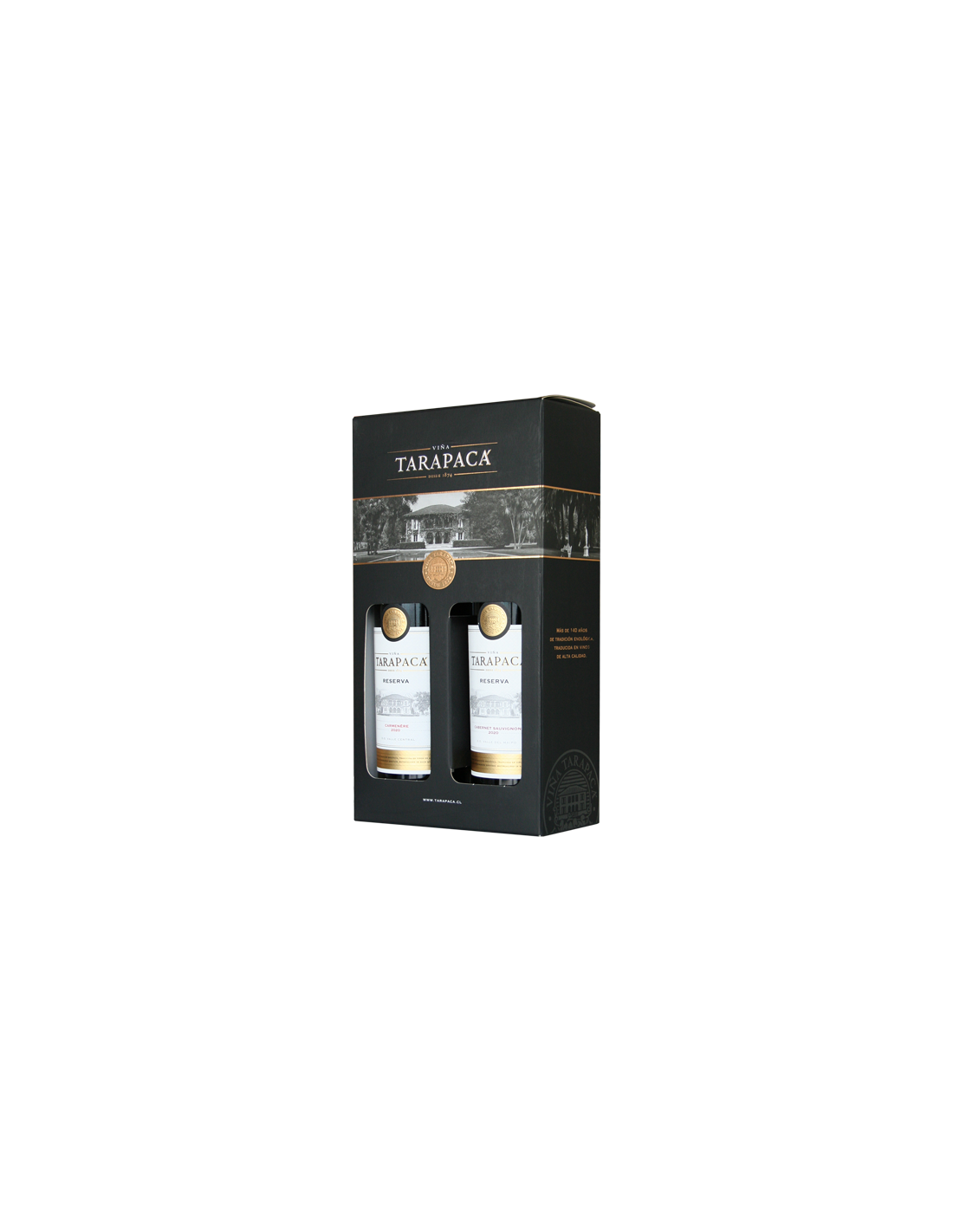 Estuche de 2 botellas de 750cc compuesto por 1 botella de Tarapacá Reserva Cabernet Sauvignon y 1 botella de Tarapacá Reserva Carmenere
