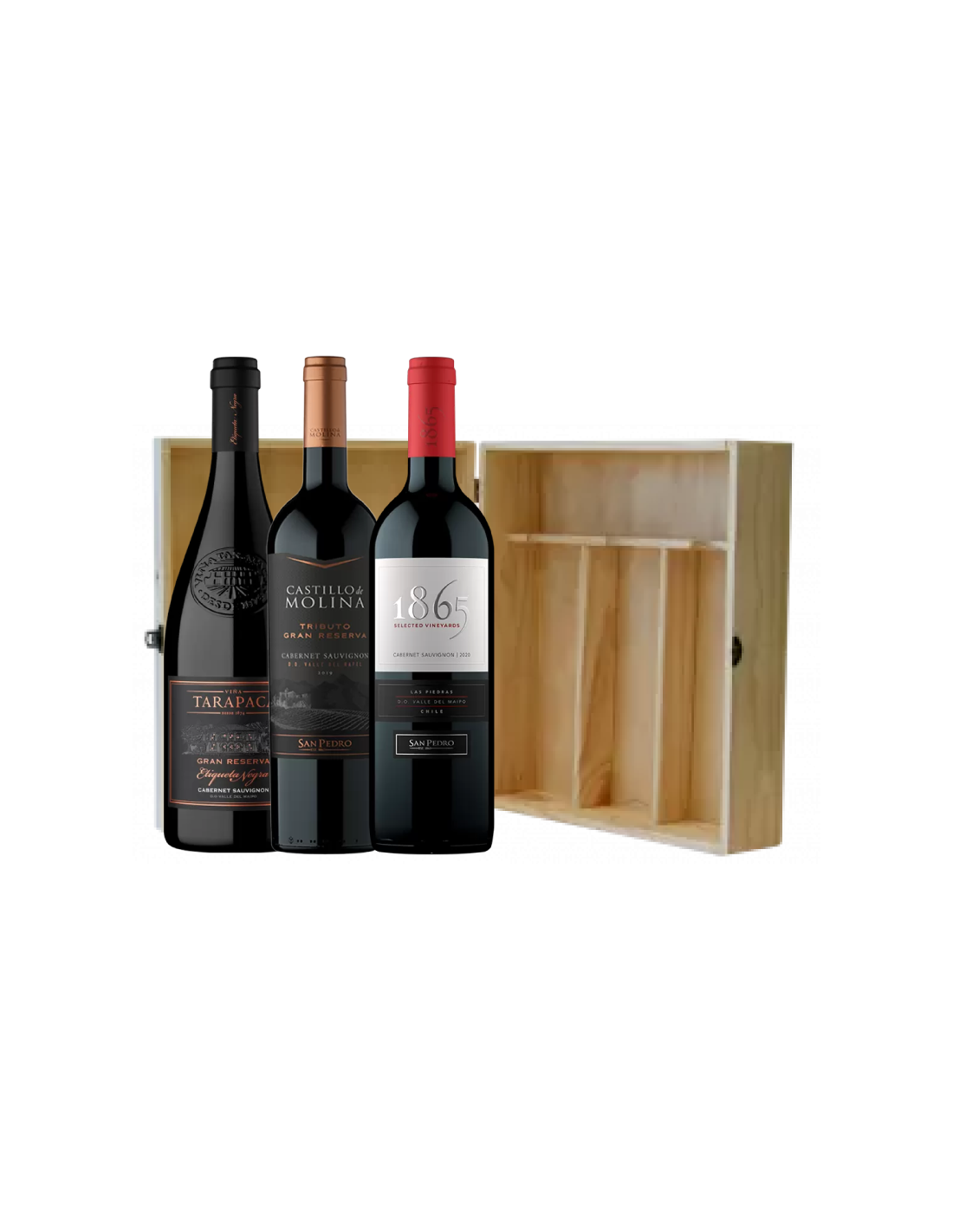 Pack de 3 botellas de 750cc compuesto por 1 botella de Tarapacá Gran Reserva Etiqueta Negra Cabernet Sauvignon, 1 botella de Castillo de Molina Tributo Cabernet Sauvignon y 1 botellas de 1865 Selected Vineyard Cabernet Sauvignon. Incluye caja de madera.